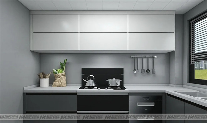 廚房內部做了L字型的布局方案,讓廚房擁有更多的儲物空間,功能分區有所側重,比較靈活多變。白色吊柜與深灰色櫥柜承上啟下,延續空間深淺搭配的風格,不顯單一枯燥。