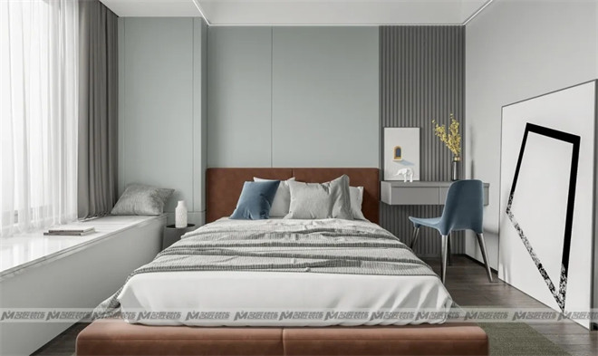 次臥的設計顯得素雅干凈,淺綠色的床背景點亮我們的視線,在感官上追求自然與靜謐,體驗內斂高級的品質棲居。