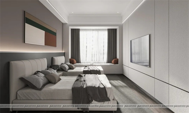 兒童房采用現代化的榻榻米+書桌+衣柜的一體化多功能設計,既能滿足孩子休息、學習、娛樂及收納的基本要求,又保持了整體風格的一致,美觀實用。