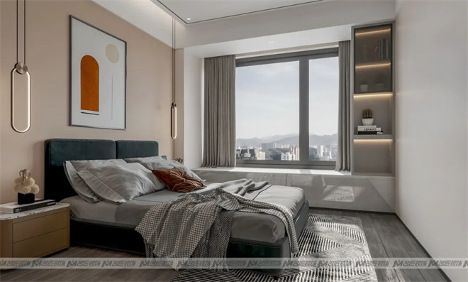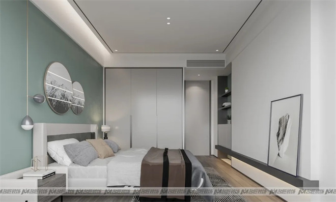 主臥的基調設計打破固化的審美觀,采用清新治愈的馬卡龍綠色作為床頭背景墻顏色,鋪上灰色木地板,裝點色彩和諧的吊燈、印象畫、掛畫等軟裝元素,鑲嵌上些許金邊,凸顯輕奢之美,簡潔而浪漫,這是心動的感覺!