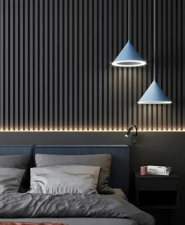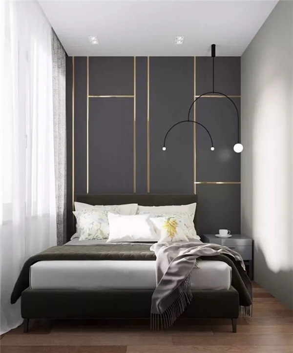 臥室空間整體采用黑灰色調搭配木質地板,穩重,大氣,卻又不失品味,有令人眼前一亮的感覺。