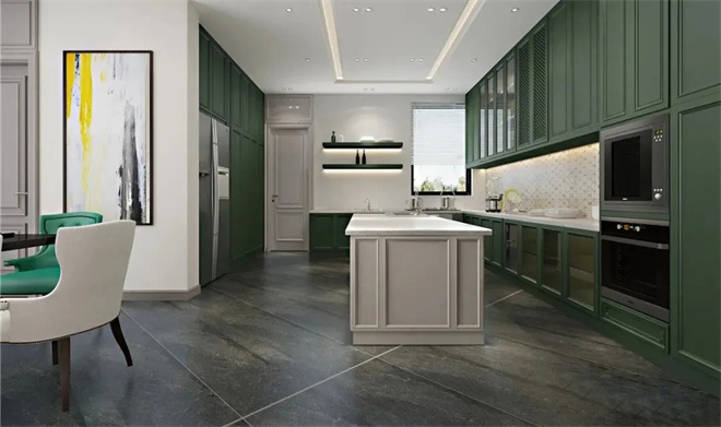 開(kāi)放式廚房大面積運(yùn)用墨綠色,與客餐的軟裝搭配好不違和,讓空間氛圍更加多元化,摒棄了過(guò)多的約束,擺脫了沉悶的裝修格局,讓空間更加開(kāi)放。